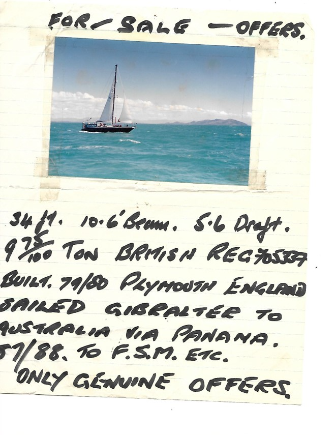 “We bought the boat from a British man named John Smith. He was a widower and was fulfilling a dream of travel and sailing. I believe he was 72 in 1991 when we bought the boat from him. He arrived in Palau, and at the urging of his daughter decided it was time to give up single-handed sailing. He posted this note on the bulletin board of the Royal Belau Yacht Club (I don’t know if this organization or Abby’s restaurant still exist in Palau). We bought it from him for $30,000 to fulfill our own dream of travel and sailing. He stayed with us at our apartment after the sale, and we took him to the airport to fly to Australia to visit his daughter. We did not hear from him again. As you heard, purchasing the boat promptly ended my infertility, and we returned to the US to have our first child.
