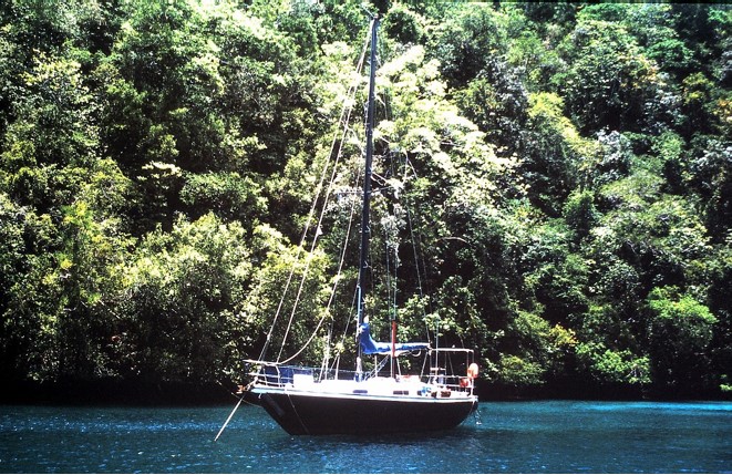 The yacht was registered in Britain and was named Morvoren of Kernow. Morvoren is Celtic for mermaid, and Kernow is the Cornish name for Cornwall. There were wooden mermaids on the bow of the boat. Picture below. I will look for more pictures. Mark registered the boat with the US Coast Guard as “Dugong”. Dugong is the Palauan word for a manatee, and there is an old sailors legend that when sailors saw mermaids they were actually seeing manatees. The story became even more prophetic for us when I became pregnant. There is a Palauan legend about how dugongs came to from a pregnant woman jumping in to the ocean”