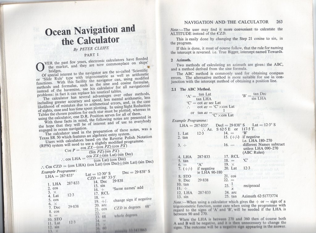 The calculation to work out the azimuth and altitude of a ‘heavenly body’ is long and complicated, but I did it simply and quickly using a scientific calculator. A TI-59 card programmable one in my case.